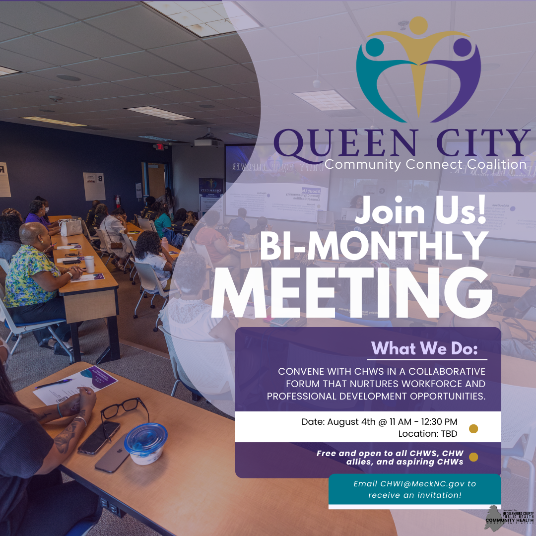 Join us for our regular bi-monthly meeting! Email CHWl@MeckNC.gov to receive an invitation - we'll send you the location of this month's meeting.